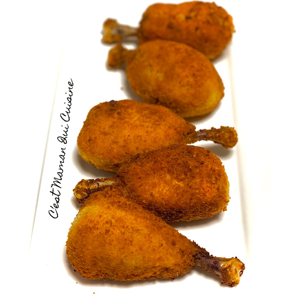 Prenez ensuite les pilons un par un et faites les rouler d’abord dans la farine, puis dans l’œuf et enfin dans la chapelure .